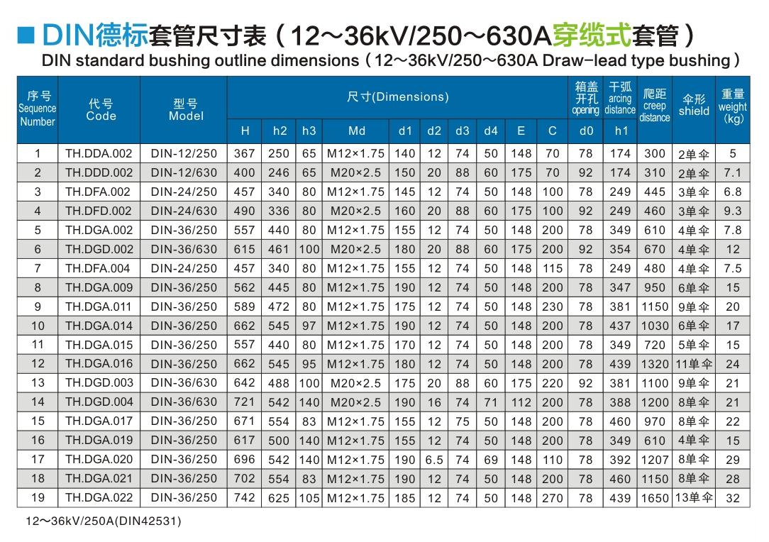 DIN德標套管12~36kV/250~630A穿纜式套管
